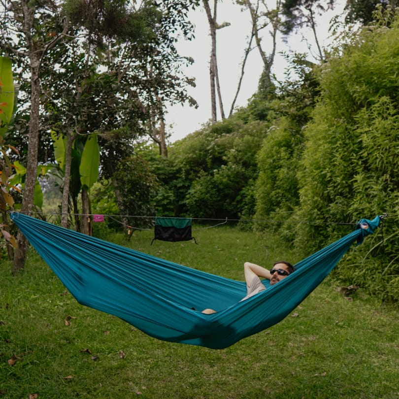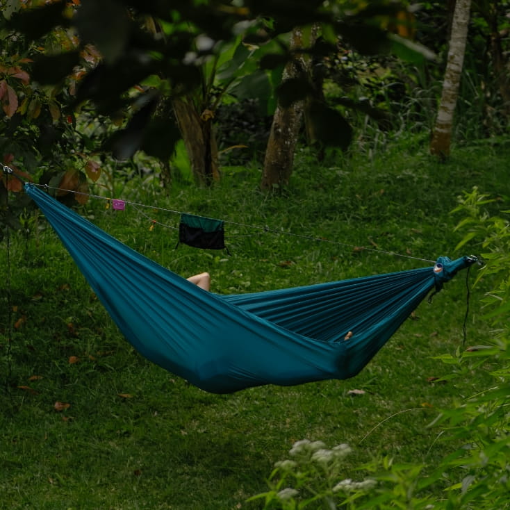 Hamak turystyczny jednoosobowy Ticket To The Moon jest łatwy w instalacji i składaniu - zajmuje to mniej niż minutę. Wystarczy znaleźć dwa większe drzewa lub inne, odpowiednie punkty mocowania. Można go bezpiecznie zawiesić nad wodą, im wyżej zawieszony nad ziemią tym bardziej będzie nas chronił przed dostaniem się do środka owadów i innych zwierząt poruszających się po ziemi. Wykonany został z hipoalergicznego nylonu spadochronowego Oeko-Tex Standard 100, który sprawia, że jest idealną propozycją dla osób z wrażliwą skórą. Materiał jest delikatny w dotyku, przewiewny i świetnie odciąża ciało. Ponadto materiał jest oddychający i szybkoschnący, dzięki czemu mamy pewność, że hamak jest odporny na pleśń. Hamak Ticket to the Moon idealnie nadaje się do zabrania w każdy zakątek Ziemi, zapewni Ci łatwy do zorganizowania komfortowy wypoczynek w terenie. Do hamaka dołączona jest wygodna torba, która nie zajmuje dużo miejsca, dzięki czemu zmieści się w każdym bagażu. Może posłużyć również jako poduszka.