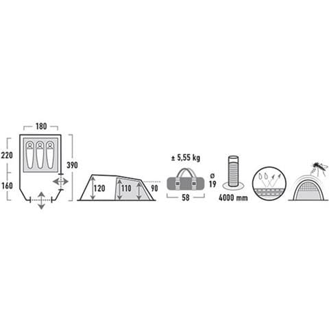 - wymiary: 220 cm ( +160 przedsionek ) x 180 cm (szerokość) x 120 cm (wysokość)