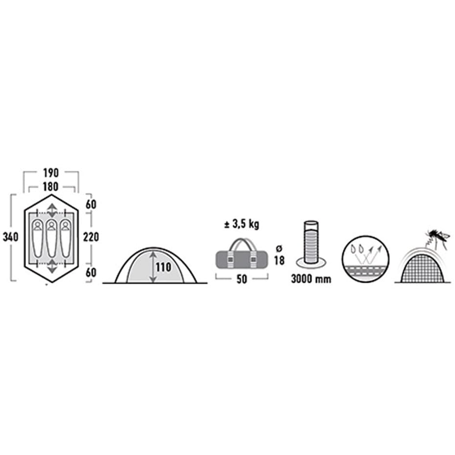 Przestronny 3-osobowy namiot typu igloo przyda się podczas kilkudniowej wycieczki za miasto i w czasie wędrówek po świecie. Dopracowana konstrukcja namiotu High Peak Woodpecker z laminowanymi szwami i wodoodpornością na poziomie 3000mm słupa wody zapewnia dobrą ochronę przed deszczem. Aby zadbać o Twój komfort, producent wyposażył wejście do namiotu w moskitierę, dzięki czemu możesz zapomnieć o nieznośnych owadach i spokojnie spać blisko natury. Odświeżony design przyciąga uwagę czerwonymi elementami, które oprócz tego, że dla bezpieczeństwa dbają o dobrą widoczność elementów konstrukcyjnych, to świetnie kontrastują z zielonym kolorem całej sylwetki namiotu. Trzyosobowy model gwarantuje wygodę wypoczynku i optymalną ilość miejsca na kilkudniową wycieczkę. Niewielkie rozmiary i waga namiotu High Peak Woodpecker zapewniają oszczędność miejsca. Kompaktowa, lekka forma sprawiają, że ten model będzie świetnym towarzyszem podczas pieszych wędrówek i rowerowych wypraw.