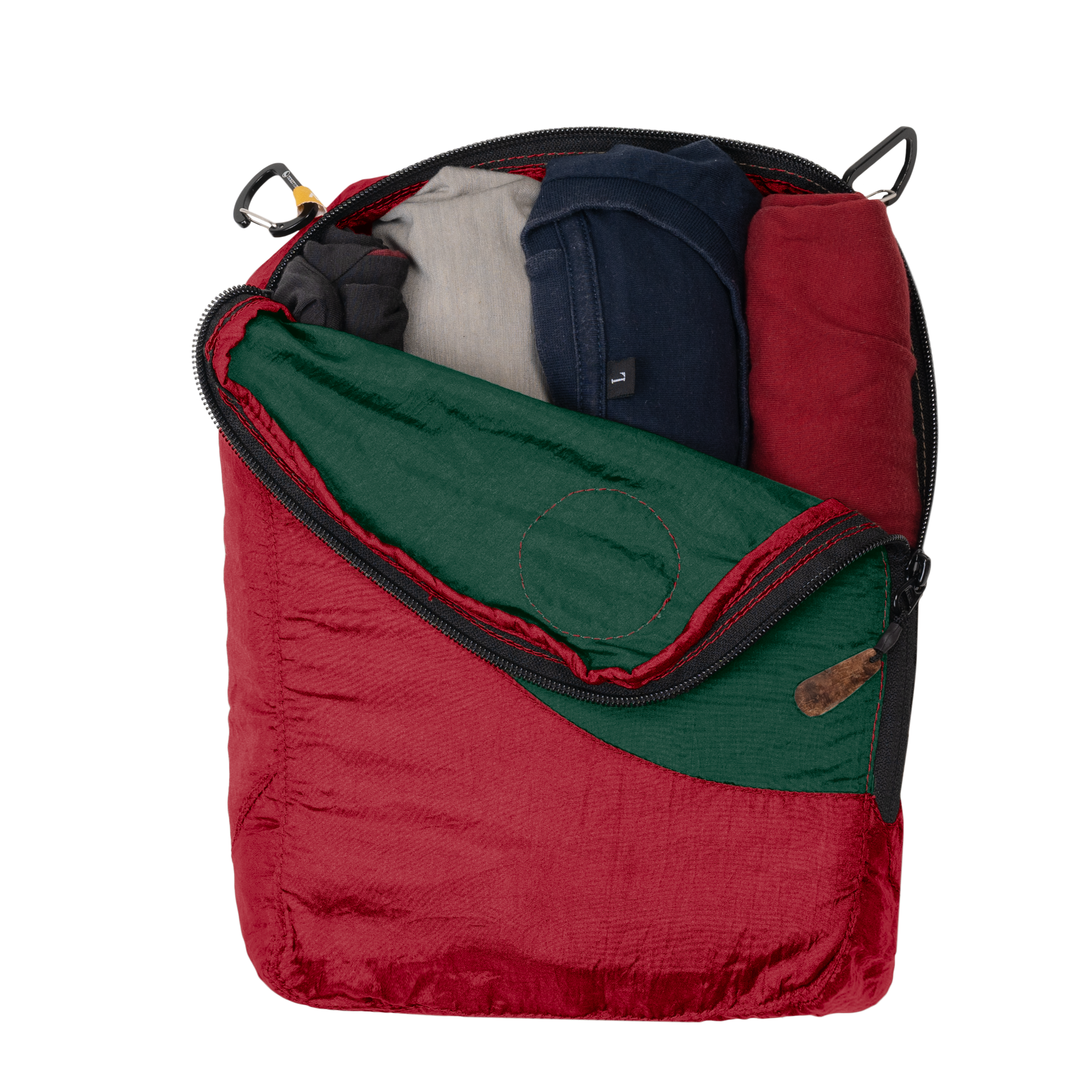 - wykonany z wytrzymałej tkaniny: upcyklingowany nylon spadochronowy, pozostały po produkcji hamaków