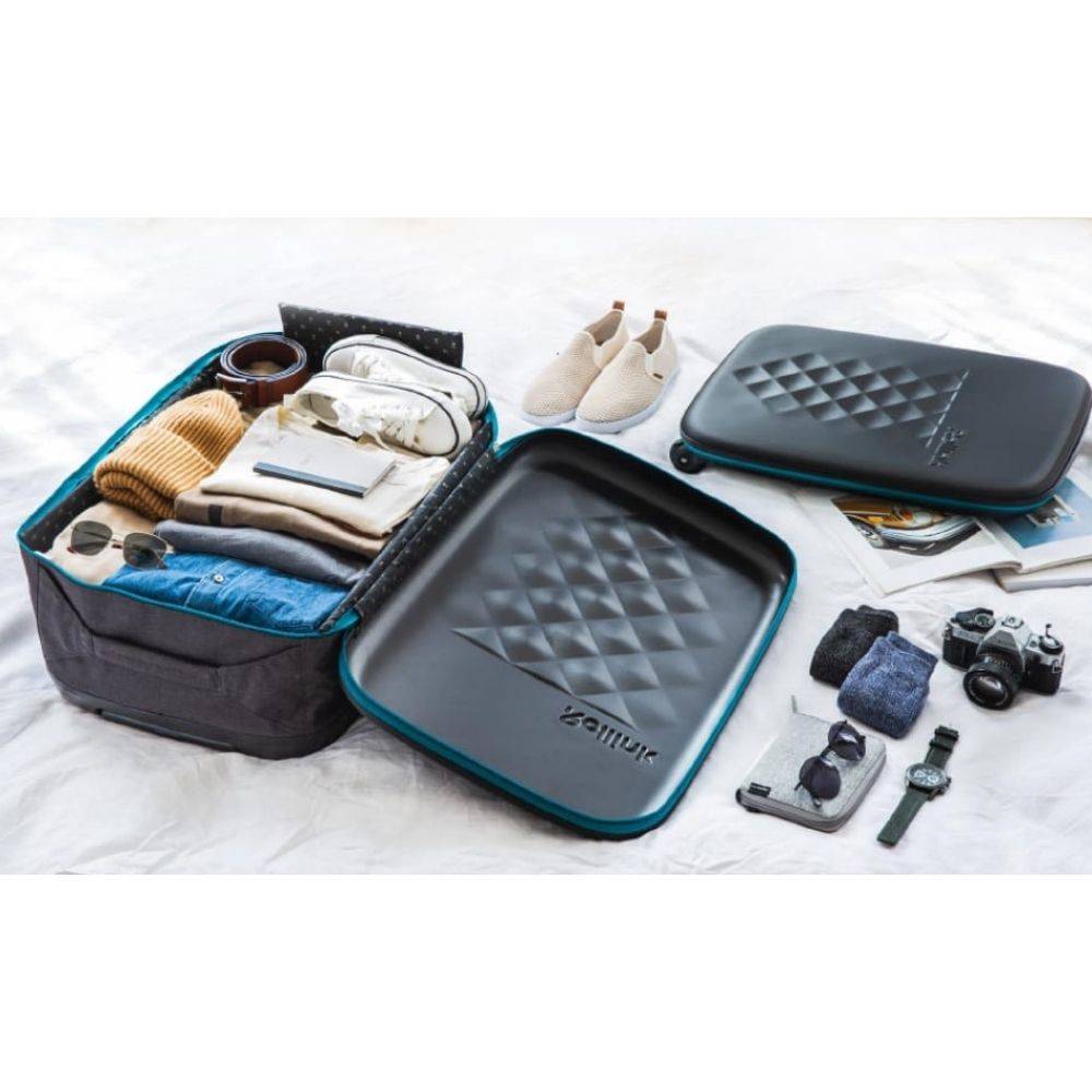 Wnętrze i boki z tkaniny pozwalają na złożenie walizki w celu kompaktowego przechowywania. Po złożeniu zajmuje niewiele miejsca i można ją schować do większej walizki jako bagaż zapasowy. Zamiast kupować kolejną torbę na dodatkowe zakupy, po prostu weź ze sobą walizkę Flex Earth, która łatwo składa się do 5 cm szerokości.